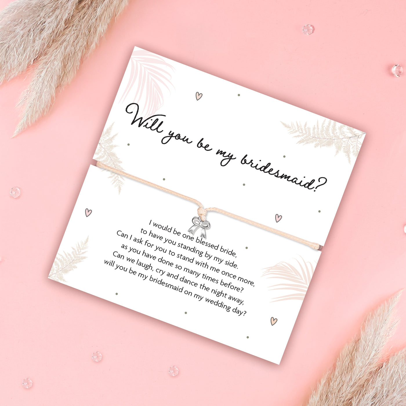 Make your bridesmaid proposal unforgettable with our Bridesmaid Proposal Bracelet, a thoughtful keepsake designed to show just how much she means to you. This bracelet features a delicate silver bow charm on a soft adjustable cord, beautifully presented on a poem card with the heartfelt words “Will you be my bridesmaid?”. Perfect for slipping into a bridesmaid proposal gift box, this bracelet is a sentimental piece of jewellery she can treasure long after your special day.