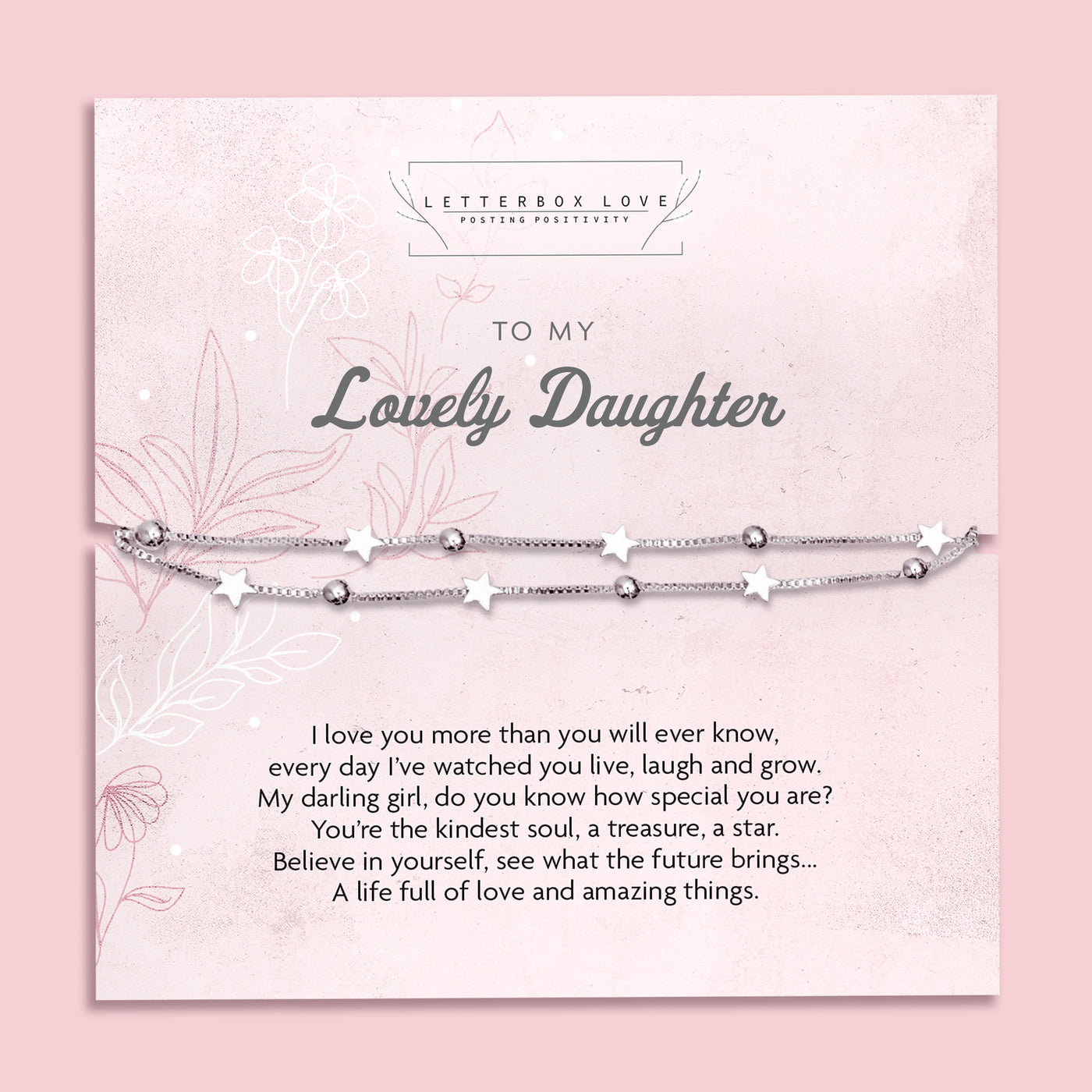 The perfect gift for your daughter no matter the occasion, our stunning 'Lovely Daughter' bracelet says it all for you. Our silver-plated beaded bracelet features a delicate heart and flower charm, symbolizing love, support, and connection. Perfect for your Daughter's birthdays, Christmas, or simply to remind her of your love, this bracelet is a meaningful gesture of appreciation.
