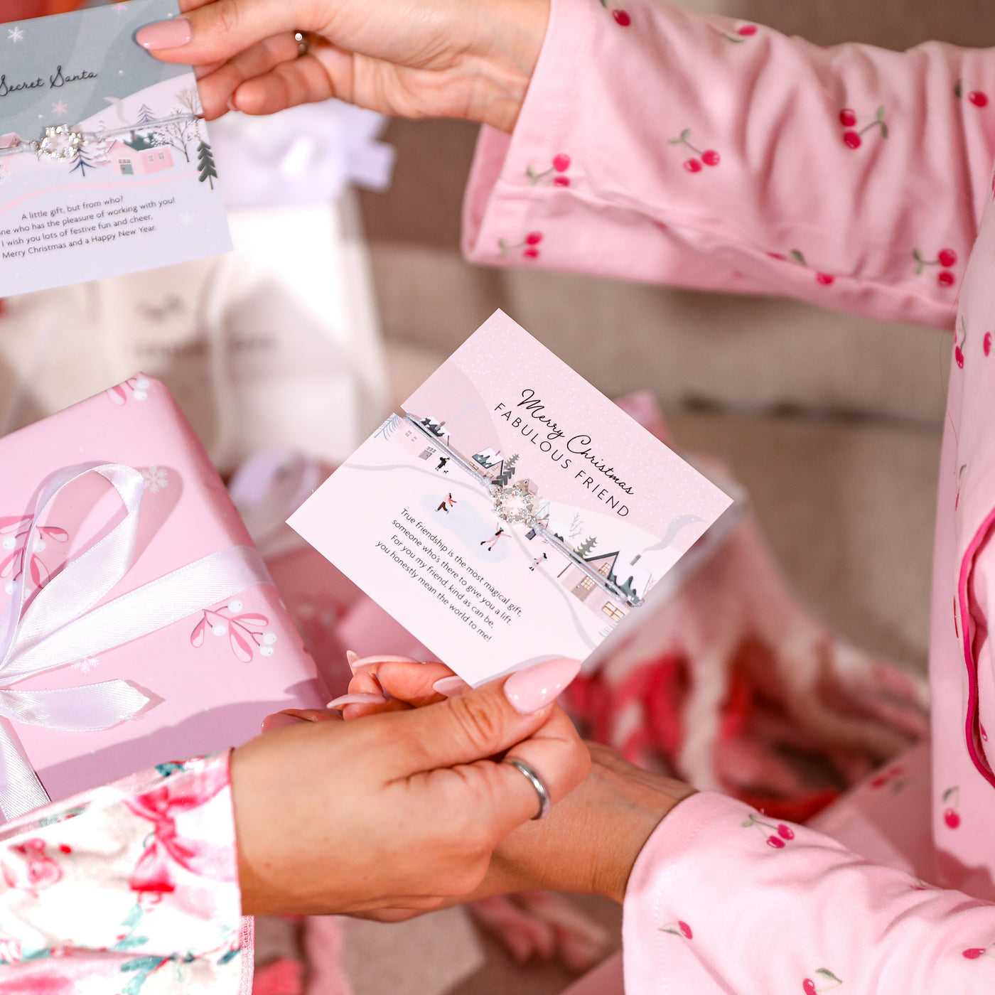 Celebrate the joy of friendship with our Merry Christmas Fabulous Friend bracelet. Featuring a delicate silver wreath charm on an adjustable cord, this festive bracelet makes a thoughtful Christmas jewellery gift for your best friend. Presented on a Christmas card with a snowy village scene and ice skaters, this bracelet captures the magic of winter and the warmth of true friendship. It also comes with a soft white pouch, making it a ready-to-give keepsake they’ll treasure long after the holidays.