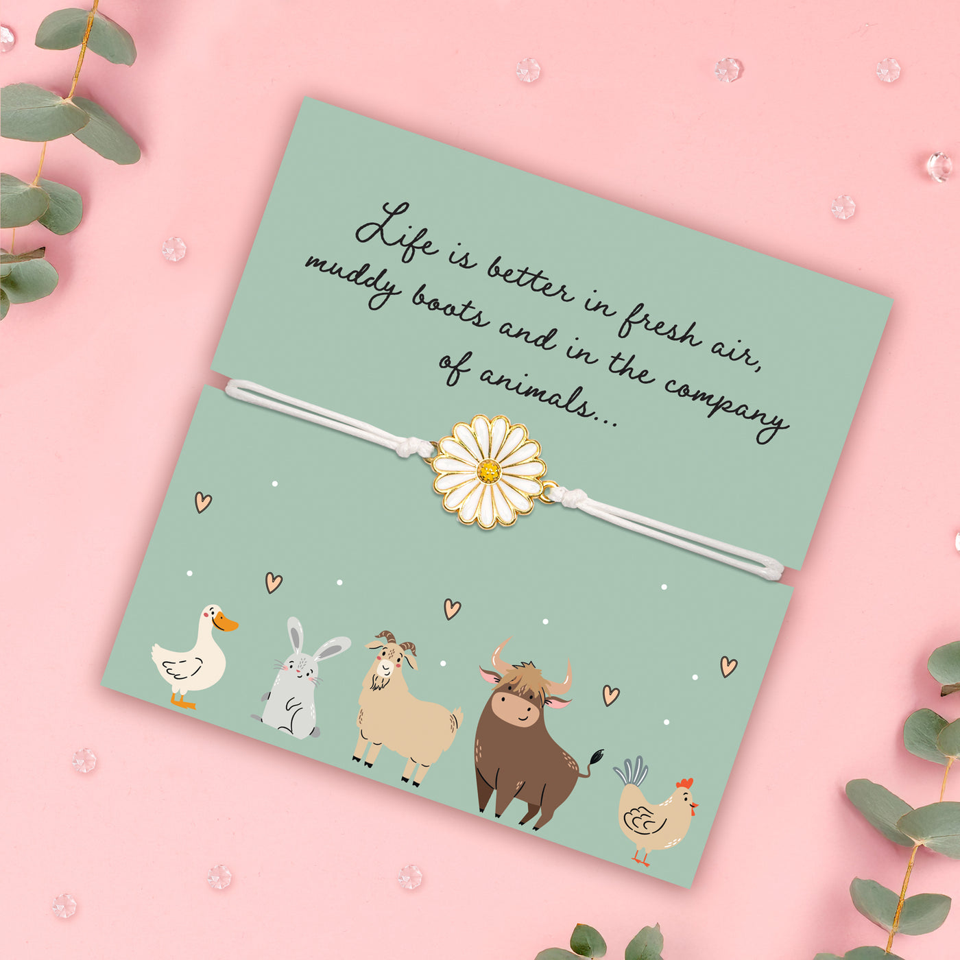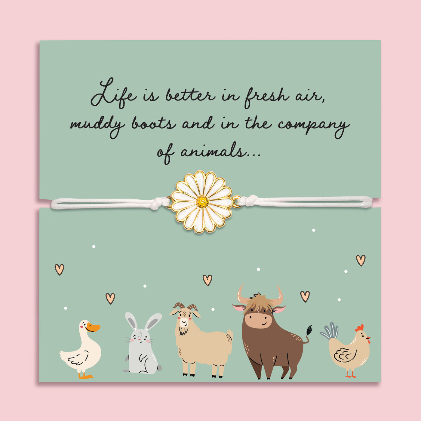 Know someone who’s happiest surrounded by animals and fresh country air? Our Life Is Better With Animals Bracelet is the perfect little gift for animal lovers and countryside souls alike! Featuring a beautiful gold and white daisy charm on a soft adjustable cord, our bracelet captures the simple joys of farm life, muddy boots, sunshine, and furry (or feathered!) friends. Presented on a sweet illustrated card with adorable farm animals, it’s a fun, thoughtful way to say “I got you!” Whether it’s for a birthday, Christmas, or just because, this bracelet is sure to bring a smile to anyone who loves the great outdoors and life on the farm.