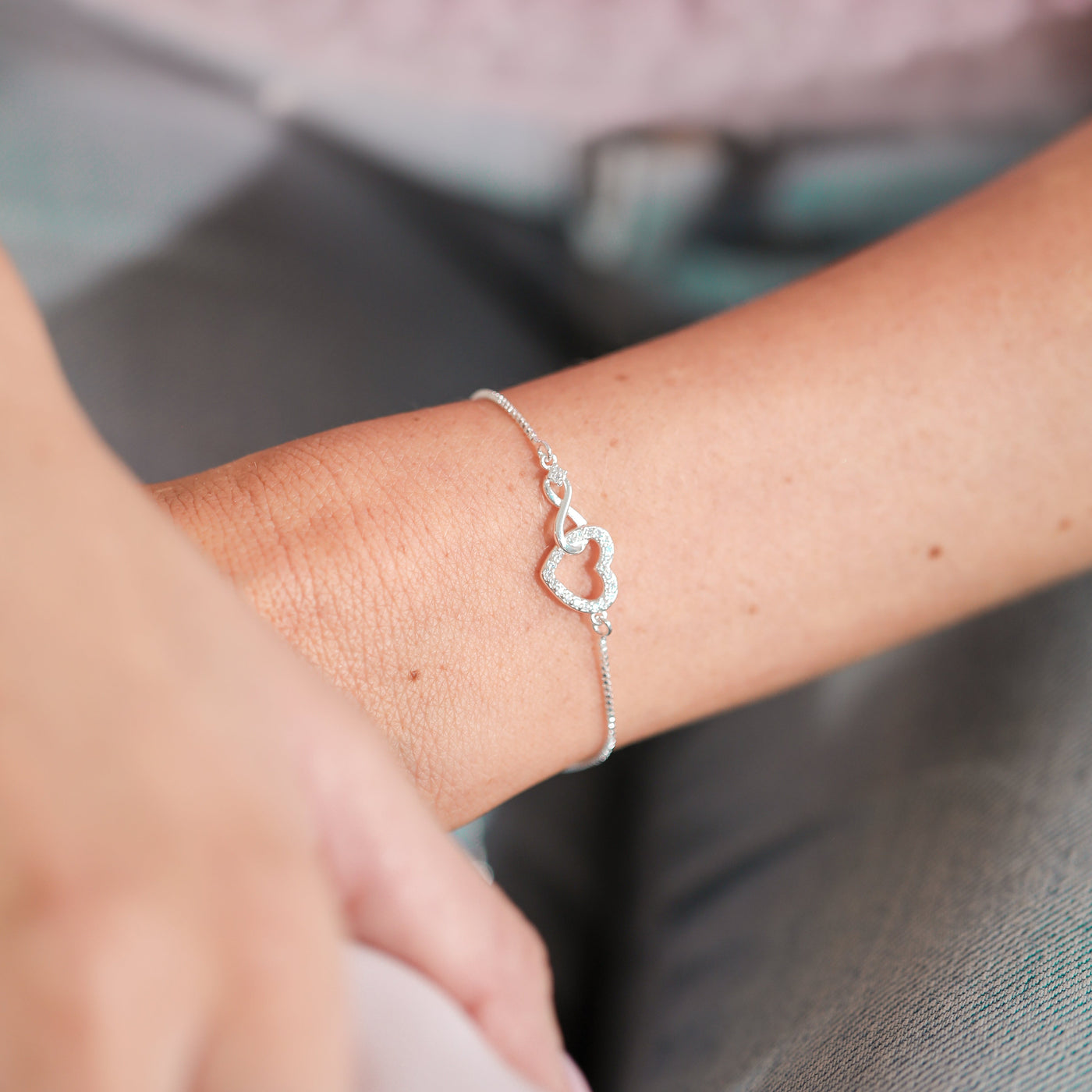 Celebrate the power of friendship with our beautiful Silver Infinity Heart Bracelet, designed to symbolise loyalty, connection and a bond that never fades. Featuring an dazzling infinity and heart centrepiece, our bracelet is a meaningful gift for a best friend, soul sister or someone who has always been there. Fully adjustable for a perfect fit, this polished silver bracelet is comfortable, stylish and ideal for everyday wear. Each piece is presented in a soft pink pouch that adds a thoughtful finishing touch, perfect for gifting birthdays, Christmas, thank you moments, self-care surprises and “just because” days.