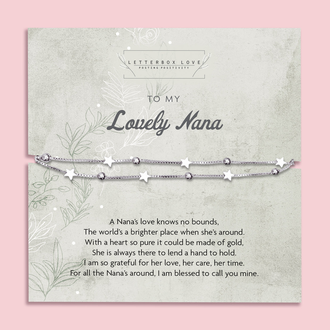 The perfect way to show your love for Nana, our Lovely Nana Bracelet is a beautiful symbol of appreciation. Our elasticated silver-plated beaded bracelet features a heart and flower charm, representing love and care. Whether for her birthday, Christmas, or just to say "thank you," this bracelet is the perfect sentimental gift for your Nana.
