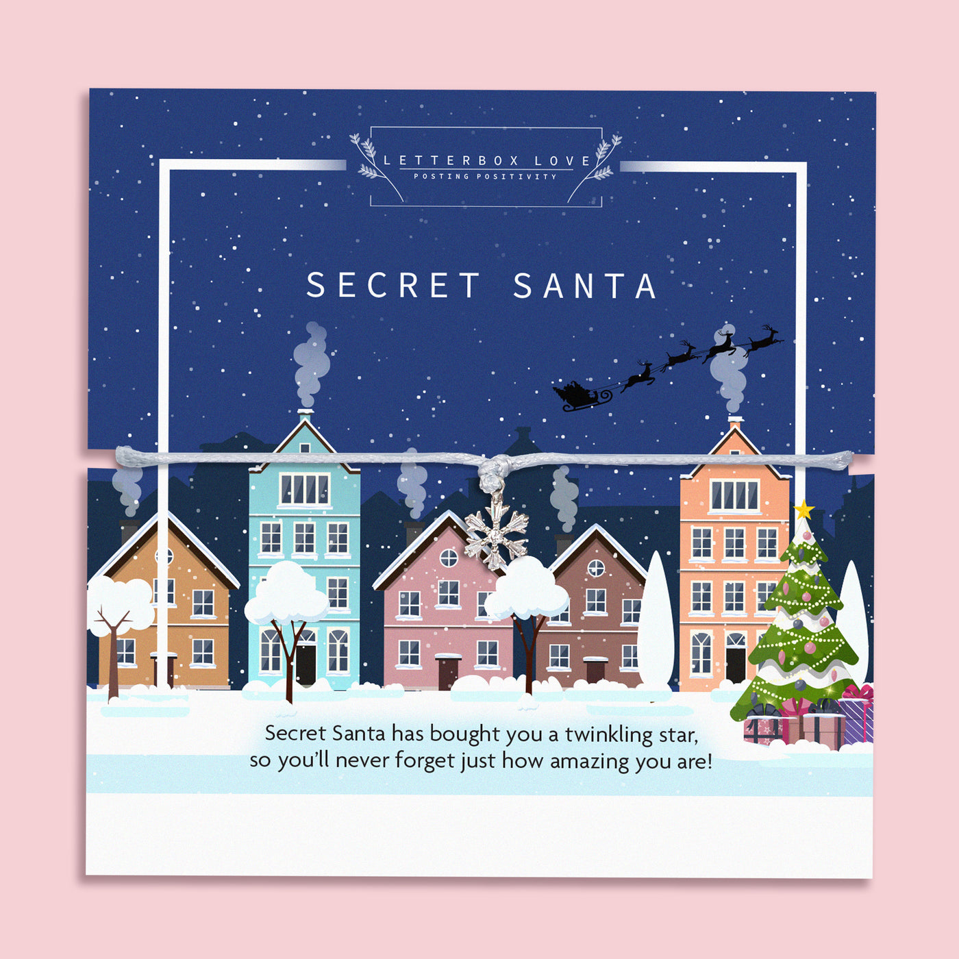 Celebrate the Secret Santa gift exchange! Featuring a sparkling silver snowflake charm, it's attached to a festive card with a winter village scene. This festive bracelet is perfect for spreading holiday cheer and making someone feel extra special this Christmas! Ideal for Secret Santa exchanges or stocking fillers.